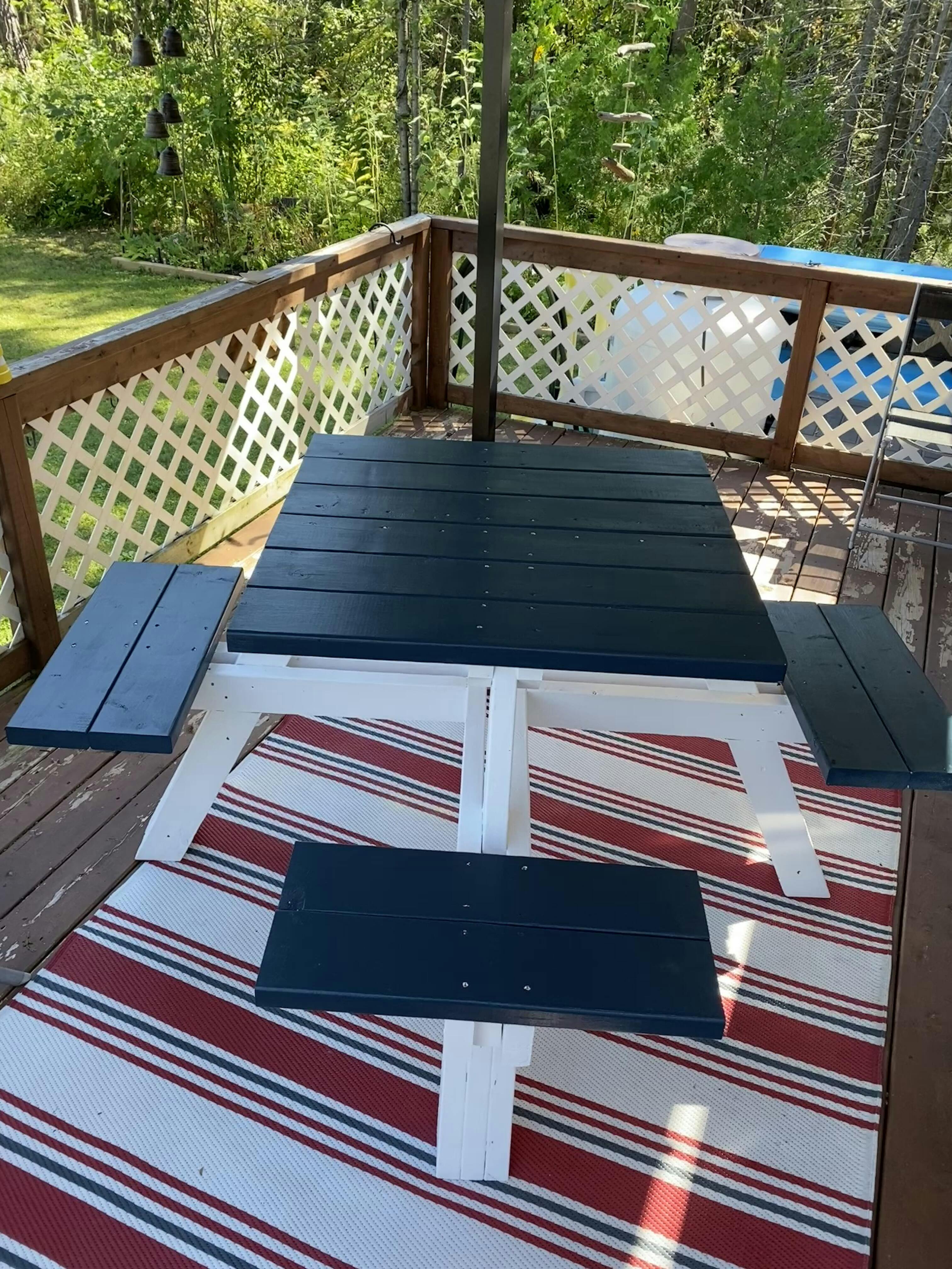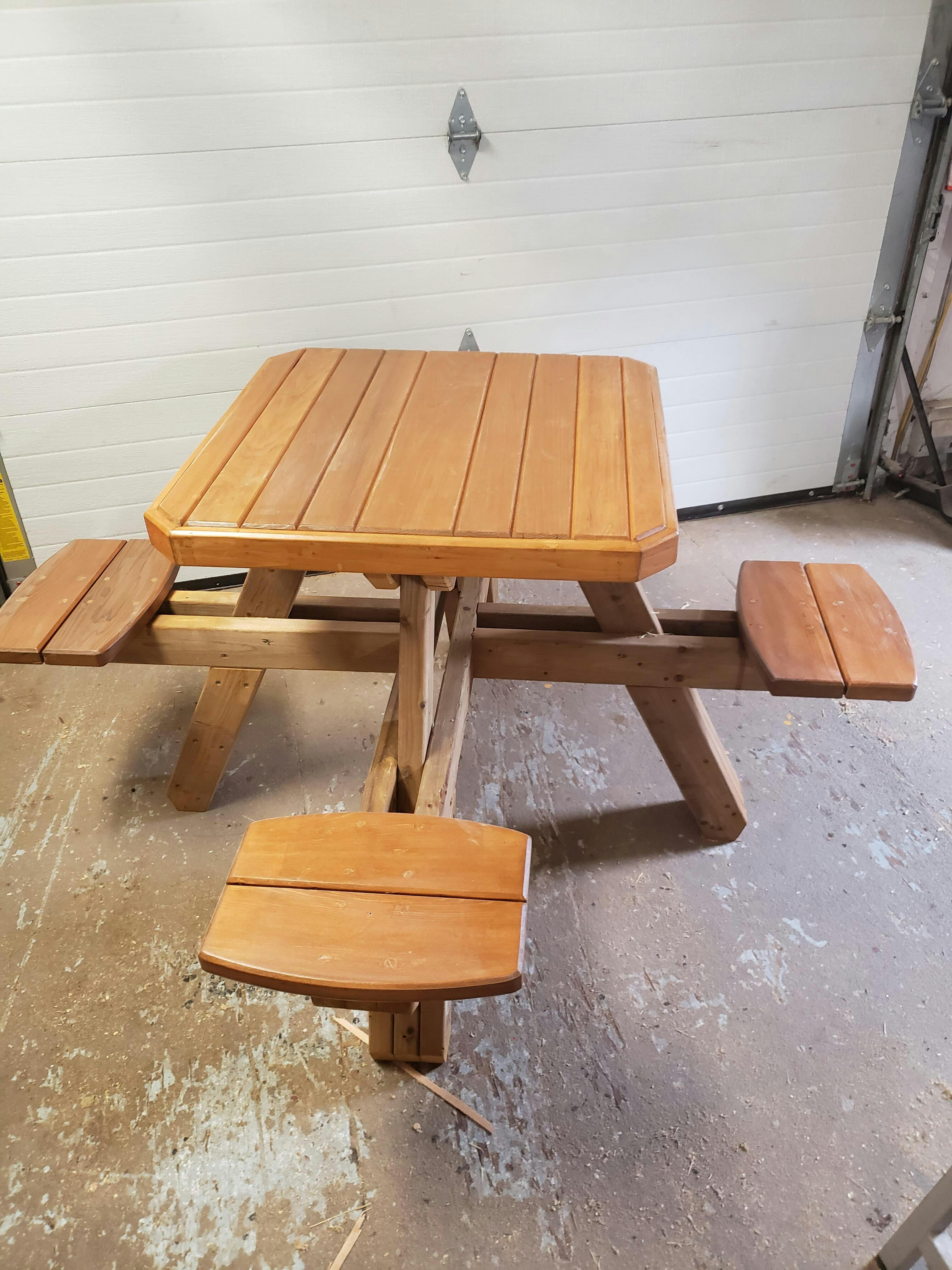 The four seater is the perfect table for the family that likes to live on the back deck. The plan is off a standard height table and seats. Great for the family barbecue and social allowing for easy access from all sides.